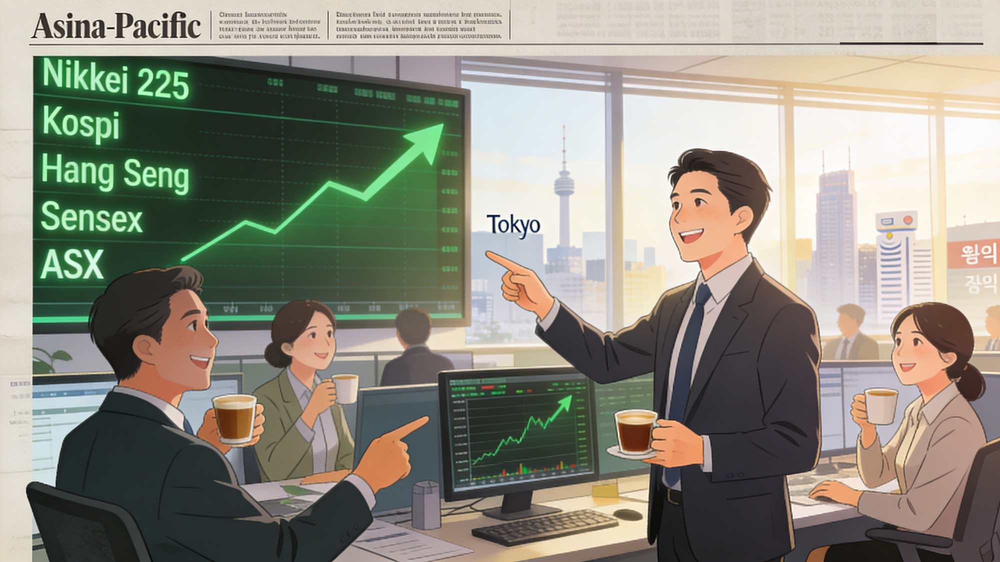 Asia-Pacific traders came into Thursday behaving less like warriors and more like optimists with calculators. Japan’s Nikkei 225 pushed to an all-time intraday high above 60,000, powered by tech stalwarts like SoftBank and Mitsubishi Heavy Industries, as investors rode the afterglow of a U.S. rally. South Korea’s Kospi joined the record-party, touching fresh highs and underscoring just how far sentiment has swung from “risk-off” to “what correction?” in a matter of weeks.